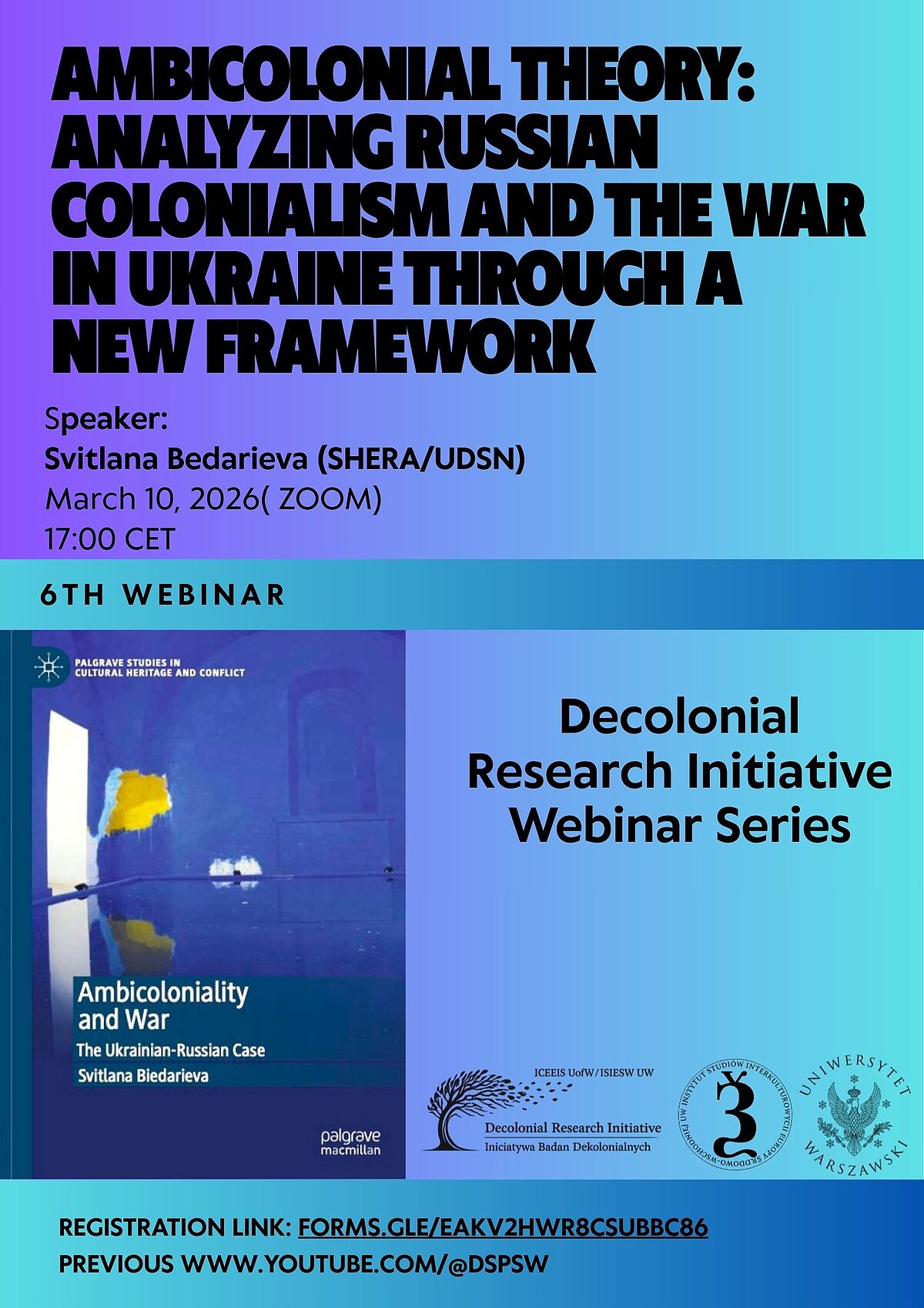 This talk will focus on ambicolonial theory as a new theoretical framework proposed by Svitlana Biedarieva in her recent book Ambicoloniality and War: The Ukrainian–Russian Case (Palgrave Macmillan, 2025) to examine the complex and intertwined colonial entanglement between Russia and Ukraine. Positioned beyond traditional postcolonial and decolonial paradigms, the concept of “ambicoloniality” challenges the linear model of colonizer versus colonized by emphasizing mutual symbolic exchange, cultural proximity, and the shared border as a site of two-way filtering of cultural and social influences. Drawing on concepts such as postcolonial hybridity versus internal hybridity, ambivalence, syncretic polarization, jouissance, and decolonial release, the theory speaks to the current situation in which Ukraine has become Russia's territory of obsession, and Russia, in its desire to occupy Ukraine, has in effect subjected itself to Ukraine’s symbolic dominance. This talk argues that the Ukrainian–Russian case offers a unique opportunity to broaden the methodology beyond that offered in postcolonial and decolonial theories by revealing how symbolic power, colonial desire, and entangled epistemic production reshape colonial dynamics in culturally adjacent regions.